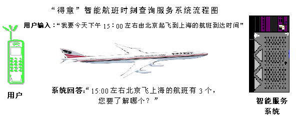 使用"得意"智能航班時(shí)刻查詢服務(wù)系統(tǒng),用戶可以通過短信/WAP/互聯(lián)網(wǎng)以自然語言的方式與服務(wù)系統(tǒng)進(jìn)行互動(dòng),方便地查詢各個(gè)航班的時(shí)刻,以及相關(guān)的信息。當(dāng)用戶在對話過程中遇到困難時(shí),系統(tǒng)還會(huì)主動(dòng)引導(dǎo)用戶獲取想要的信息,能為乘客和交通機(jī)構(gòu)提供很好的服務(wù)手段,實(shí)現(xiàn)真正的"智能"。