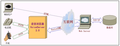 聲軟科技的《語(yǔ)音網(wǎng)站系統(tǒng) 3.0》的核心系統(tǒng)是本公司的拳頭產(chǎn)品VoiceServer 3.0。VoiceServer 3.0和企業(yè)互聯(lián)網(wǎng)站上的Web服務(wù)器組成企業(yè)的語(yǔ)音門戶網(wǎng)站。只需在網(wǎng)站上存放相應(yīng)的VoiceXML頁(yè)面,客戶撥打連接VoiceServer的接入電話號(hào)碼,VoiceServer利用語(yǔ)音瀏覽的功能播放網(wǎng)站上的內(nèi)容,系統(tǒng)就能運(yùn)轉(zhuǎn)起來(lái),為客戶提供語(yǔ)音服務(wù)。以下是系統(tǒng)結(jié)構(gòu)圖: