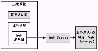 從上圖可以看出,座席端所有的業(yè)務處理都是在Web瀏覽器上進行的,所以無論是利用原有系統(tǒng)還是新開發(fā)系統(tǒng),用戶都不必要關心座席的具體實現(xiàn)方式,要做的僅僅是編寫新的JSP,ASP等可訪問后臺業(yè)務的Web頁面,然后進行簡單的配置就可以完成業(yè)務的擴充功能。