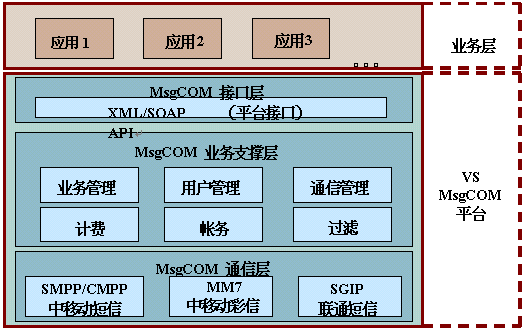 MsgCOM是Voicesoft專(zhuān)門(mén)為移動(dòng)內(nèi)容提供商或企業(yè)開(kāi)發(fā)的移動(dòng)通信平臺(tái),它支持SMS短信(SMPP/CMPP)、MMS彩信(MM7)、聯(lián)通短信(SGIP)等等通信協(xié)議,同時(shí)提供對(duì)各種業(yè)務(wù)支持的業(yè)務(wù)支持層,為各種業(yè)務(wù)提供了簡(jiǎn)單靈活的業(yè)務(wù)二次開(kāi)發(fā)接口;MsgCOM屏蔽了所有的底層通信協(xié)議和復(fù)雜的業(yè)務(wù)管理、計(jì)費(fèi)管理、用戶(hù)管理等等內(nèi)容,為用戶(hù)提供了一個(gè)簡(jiǎn)單、高層、靈活的業(yè)務(wù)定制接口,便于內(nèi)容提供商和企業(yè)定制自己的移動(dòng)應(yīng)用,MsgCOM將具有廣泛應(yīng)用市場(chǎng),歡迎各大系統(tǒng)集成商、移動(dòng)內(nèi)容提供商、知名企業(yè)來(lái)電來(lái)函進(jìn)行合作。