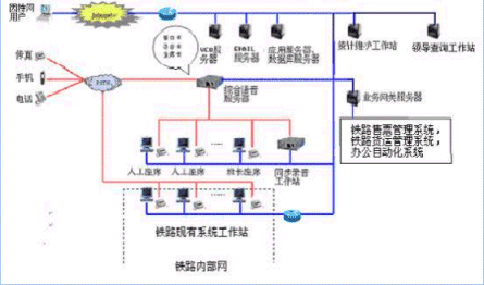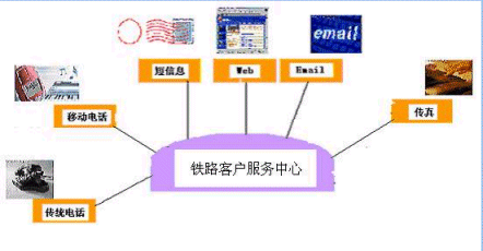 客戶(hù)利用電話、傳真、電子郵件、因特網(wǎng)、手機(jī)、網(wǎng)絡(luò)電話等撥打某統(tǒng)一特服號(hào)碼(如100xxxx)進(jìn)入鐵路客戶(hù)服務(wù)中心系統(tǒng),本系統(tǒng)依托鐵路各類(lèi)業(yè)務(wù)技術(shù)支持系統(tǒng)和網(wǎng)絡(luò)系統(tǒng),通過(guò)人工受理或自動(dòng)語(yǔ)音服務(wù)等方式全天24小時(shí)不間斷地為旅客、貨主提供各種鐵路服務(wù);形成了對(duì)外服務(wù)于客戶(hù),對(duì)內(nèi)管理、分析、決策系統(tǒng)相結(jié)合的新型客戶(hù)服務(wù)中心。