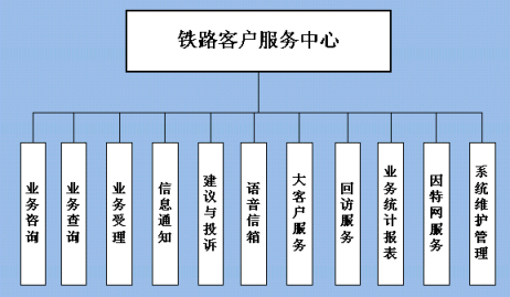 鐵路客戶(hù)服務(wù)中心系統(tǒng)的業(yè)務(wù)功能結(jié)構(gòu)如下圖所示: