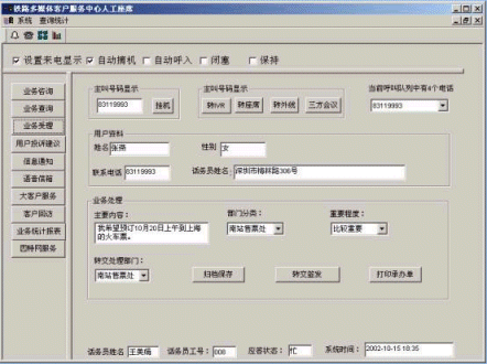客戶(hù)打入電話后,當(dāng)系統(tǒng)的自動(dòng)語(yǔ)音應(yīng)答子系統(tǒng)無(wú)法解決客戶(hù)問(wèn)題時(shí),客戶(hù)可選擇人工服務(wù),由鐵路客戶(hù)服務(wù)代表直接接聽(tīng)客戶(hù)電話,處理并解決客戶(hù)問(wèn)題。此時(shí)客戶(hù)同座席話務(wù)人員直接溝通,并同時(shí)記錄下該客戶(hù)的聯(lián)系方式,將相關(guān)數(shù)據(jù)添加入系統(tǒng)數(shù)據(jù)庫(kù);也可以在數(shù)據(jù)庫(kù)的支持下回答國(guó)家和地方的鐵路信息及相關(guān)規(guī)定等的咨詢(xún)和疑問(wèn)?蛻(hù)也可以選擇自動(dòng)語(yǔ)音服務(wù)方式,根據(jù)系統(tǒng)的語(yǔ)音提示輸入按鍵,選擇類(lèi)別,將自己的投訴和建議以及自己的聯(lián)系方式信息以留言錄音的方式保存在系統(tǒng)中。系統(tǒng)同時(shí)還支持自動(dòng)傳真方式,客戶(hù)可以通過(guò)傳真機(jī)進(jìn)入本系統(tǒng),通過(guò)按鍵選擇傳真方式,將自己的意見(jiàn)建議等的文本內(nèi)容傳真給系統(tǒng),系統(tǒng)自動(dòng)接受并存入數(shù)據(jù)庫(kù)。