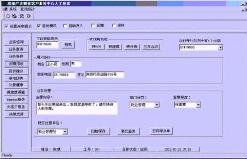。。接通呼叫中心的電話后,按語音提示選擇相應(yīng)的服務(wù),選擇相應(yīng)的服務(wù)功能鍵后,在服務(wù)人員的計(jì)算機(jī)屏幕上自動(dòng)彈出對話框顯示用戶的詳細(xì)信息。