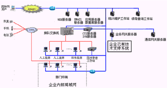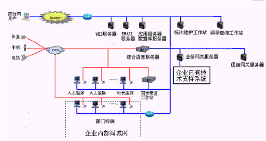 網(wǎng)上服務(wù)系統(tǒng):與INTENET結(jié)合,接受來自網(wǎng)上的呼叫請求,提高服務(wù)和營銷的質(zhì)量和效率。