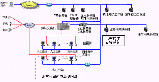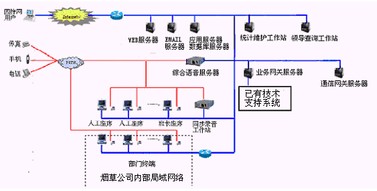 卷煙經(jīng)銷(xiāo)戶(hù)等客戶(hù)利用電話(huà)、傳真、電子郵件、因特網(wǎng)、手機(jī)、短消息等撥打統(tǒng)一的特服號(hào)碼(如800XXX或9XXXX)進(jìn)入煙草公司呼叫中心,本系統(tǒng)依托煙草公司各類(lèi)業(yè)務(wù)技術(shù)支持系統(tǒng)和網(wǎng)絡(luò)系統(tǒng),實(shí)現(xiàn)煙草專(zhuān)賣(mài)局原有管理系統(tǒng)/業(yè)務(wù)系統(tǒng)及數(shù)據(jù)庫(kù)的無(wú)縫連接,通過(guò)人工受理或自動(dòng)語(yǔ)音服務(wù)等方式全天24小時(shí)不間斷地為客戶(hù)提供各種服務(wù)。