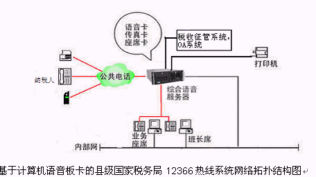 本系統(tǒng)提供基于計算機(jī)語音板卡和交換機(jī)兩種語音接入方式,都支持1號和7號信令線路的接入。對于省級-地市級的稅務(wù)局12366多媒體納稅服務(wù)熱線系統(tǒng),可選用交換機(jī)作為語音接入設(shè)備,保障系統(tǒng)的可靠性和穩(wěn)定性;對于20個以下座席的縣級國家稅務(wù)局12366多媒體納稅服務(wù)熱線系統(tǒng),則建議使用基于計算機(jī)語音板卡的形式,可以減少企業(yè)投資。