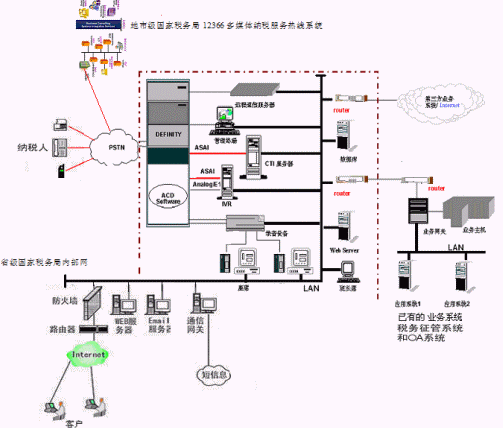 系統(tǒng)支持省-市-縣國家稅務(wù)局12366多媒體熱線系統(tǒng)的語音和數(shù)據(jù)聯(lián)網(wǎng); 提供完善的組網(wǎng)方案,實(shí)現(xiàn)資源共享,統(tǒng)一提供服務(wù)。