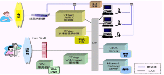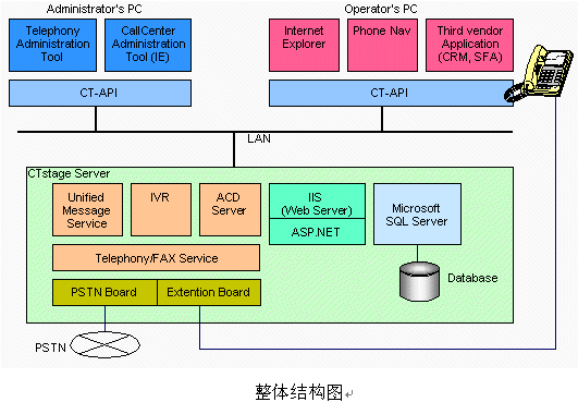 隨著經(jīng)營環(huán)境和企業(yè)環(huán)境的日益激化,作為新時代的信息策略,計(jì)算機(jī)電話集成(CTI)也由于投資小效益大而倍受注目。沖電氣公司的CTstage實(shí)現(xiàn)最先端的多媒體通信的UnPBX(在服務(wù)器中加插電話板卡,以單臺計(jì)算機(jī)實(shí)現(xiàn)PBX功能的系統(tǒng))型的開放式CTI系統(tǒng)。在一臺PC服務(wù)器上實(shí)現(xiàn)IVR和ACD功能、內(nèi)線電話控制、ACD監(jiān)視器等呼叫中心所需要的功能,成為真正意義上的UnPBX呼叫中心。先進(jìn)的CTI的解決方案將作為企業(yè)的經(jīng)營策略,迅速提高適應(yīng)市場的能力。