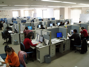 當(dāng)你站在這布局緊湊但井井有條、具有典型日式風(fēng)格的辦公大廳里,看到這些彬彬有禮的座席代表,耳邊又不時傳來各種聲調(diào)的日語時,你會毫不懷疑地認為自己是在東京或是橫濱的某個大公司的呼叫中心里。然而,從大廈的窗外望去,遠處聳立的大連電視塔和眼前的勞動公園都提醒你:這是在中國大連的商業(yè)區(qū)中心。