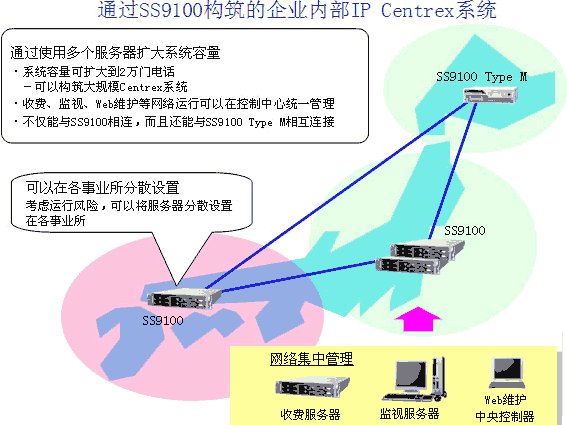 多個(gè)SS9100服務(wù)器相互協(xié)作,擴(kuò)大了系統(tǒng)整體容量。以往模型由1個(gè)服務(wù)器構(gòu)成,系統(tǒng)最大只能容納5千門(mén)電話(huà),而SS9100 R5可以構(gòu)筑將系統(tǒng)整體容量擴(kuò)展到容納2萬(wàn)門(mén)電話(huà)的大規(guī)模Centrex系統(tǒng)。進(jìn)而,通過(guò)將服務(wù)器分散設(shè)置在各事業(yè)所的形式,可以考慮分散各事業(yè)所之間故障危險(xiǎn)的基礎(chǔ)上構(gòu)筑系統(tǒng)。