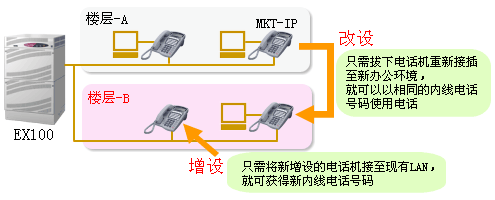 在變更辦公環(huán)境時(shí),只需將IP多功能電話機(jī)接到新辦公環(huán)境的LAN上,無(wú)需布線工程,可以大幅度削減布線工程費(fèi)用。