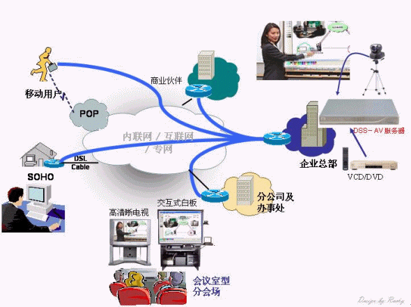 某跨地區(qū)生產(chǎn)企業(yè),總部及生產(chǎn)工廠在東莞、設(shè)計(jì)所在廣州、樣本設(shè)計(jì)所在香港,研發(fā)機(jī)構(gòu)在美國。全國各省市有上百家專賣店,其中重點(diǎn)賣場有三十余家。設(shè)計(jì)所、工廠、重點(diǎn)賣場通過DSS超媒體通訊系統(tǒng)的音、視頻及數(shù)據(jù)功能進(jìn)行交流溝通,市場部通過該系統(tǒng)可以進(jìn)行全國性的培訓(xùn)、交流,并應(yīng)用于產(chǎn)品展示。