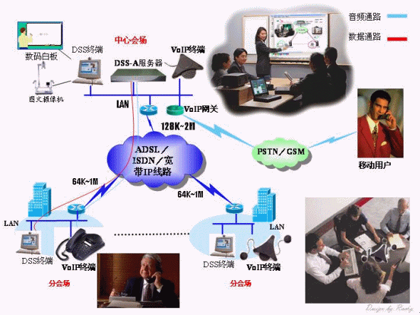 DSS超媒體視訊系統(tǒng)是以主會(huì)場為中心,通過結(jié)合視頻、音頻、數(shù)據(jù)及網(wǎng)絡(luò)通訊技術(shù),同時(shí)與多個(gè)分會(huì)場進(jìn)行交流,其效果如同在一間大會(huì)議室開會(huì)一樣。參與會(huì)議的成員能實(shí)時(shí)交流會(huì)議內(nèi)容(文字、圖片等),并對其進(jìn)行注釋和修改。能夠高效率地進(jìn)行文件傳送、方案討論、工作匯報(bào)、遠(yuǎn)程教學(xué)等各種會(huì)議。