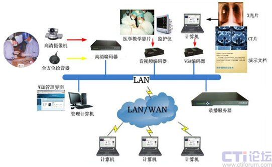 同時(shí),銳取多媒體系統(tǒng)前端VGA編碼器將采集到的計(jì)算機(jī)信號(hào)(包含通過網(wǎng)絡(luò)訪問的DR/CR片、CT片)進(jìn)行實(shí)時(shí)編碼和壓縮,通過網(wǎng)絡(luò)與高清視音頻信號(hào)以及普通視音頻信號(hào)同步傳輸?shù)戒J取多媒體錄播系統(tǒng)遠(yuǎn)程醫(yī)療系統(tǒng)后臺(tái)服務(wù)器上。