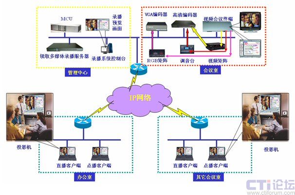 如圖所示:多媒體錄播服務(wù)器放置在管理中心,高清編碼器(采集高清視頻及聲音)及VGA編碼器(采集雙流信號)放置在會(huì)議室,客戶端可以是網(wǎng)絡(luò)內(nèi)的任意一臺計(jì)算機(jī)。整個(gè)系統(tǒng)簡單明了,分布靈活,部署簡單,系統(tǒng)只要連接了信號線,配置了IP地址即可投入使用,無須專業(yè)布線。各部分配置如下: