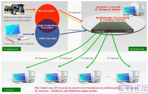 銳取的多媒體錄播系統(tǒng)最基本的功能是可對(duì)可視化信息進(jìn)行錄制,直播與點(diǎn)播。系統(tǒng)采用基于IP網(wǎng)絡(luò)的分布式架構(gòu),有前臺(tái)的編碼器及后臺(tái)的服務(wù)器組成?蛻(hù)端通過(guò)計(jì)算機(jī)接收。
