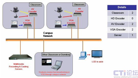 為了讓學(xué)生能更輕松地掌握課程內(nèi)容,學(xué)校的老師們希望可以有這樣一個(gè)系統(tǒng)可以將某個(gè)老師或?qū)<业闹v課內(nèi)容錄制下來(lái),并能實(shí)時(shí)的傳到其它的教室,大堂,甚至學(xué)生的宿舍。而內(nèi)容必須包括老師的圖像及在電腦上播放的多媒體課件。通過(guò)這個(gè)系統(tǒng)學(xué)生可以隨時(shí)隨地的進(jìn)行到課程的學(xué)習(xí),構(gòu)建“無(wú)障礙學(xué)習(xí)校園”。