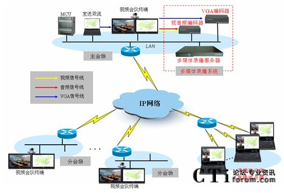 銳取多媒體錄播系統(tǒng)部署在中國疾控中心主會場,通過視音頻編碼器及VGA編碼器采集視頻會議終端輸出的本地、遠(yuǎn)端會議及雙流圖像,并通過IP網(wǎng)絡(luò)將采集的信號編碼后發(fā)送給位于機房的多媒體錄播服務(wù)器,由服務(wù)器實現(xiàn)視頻會議的錄制、直播、點播。分會場及不具備視頻會議設(shè)備的會議可通過IE瀏覽器訪問多媒體錄播服務(wù)器,接收會議的實時直播或進行事后點播。
