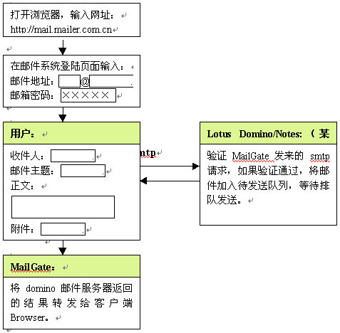 金笛郵件網(wǎng)關(guān)完全基于B/S架構(gòu)的設(shè)計(jì),使得郵件收發(fā)、管理都是基于瀏覽器完成,客戶端只要打開IE瀏覽器即可,無(wú)需做任何設(shè)置,大大方便了用戶。也就是說(shuō),在城域網(wǎng)任一節(jié)點(diǎn),都可以通過(guò)內(nèi)部域名(DNS)訪問(wèn)郵件網(wǎng)關(guān),然后通過(guò)郵件網(wǎng)關(guān)與用戶所在的domino郵件服務(wù)器通訊,將郵件主題、郵件內(nèi)容顯示在web頁(yè)面上。金笛?郵件網(wǎng)關(guān)的具體工作流程如下: