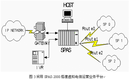 中國加入WTO后,國內(nèi)與國際的聯(lián)系、交流和溝通將會越來越頻繁,這一趨勢帶來了巨大的電信服務(wù)市場商機(jī)。同時,國際電信企業(yè)正在尋求進(jìn)入中國的途徑,國內(nèi)新興的電信運(yùn)營商積極應(yīng)對這種局面,而虛擬電信運(yùn)營商也在國內(nèi)開始出現(xiàn)。如何爭取客戶是所有這些提供電信服務(wù)的企業(yè)共同面臨的課題。一個智能化的、高效的、靈活的、有特點(diǎn)并易于控制的服務(wù)平臺無疑是他們進(jìn)行競爭的重要工具。由于SPAS-2000可編程交換機(jī)是一個全開放的靈活平臺,用戶通過應(yīng)用程序幾乎可以完全控制交換,能很好的滿足用戶的需求。在此SPAS-2000可編程交換機(jī)上開發(fā)的電話批發(fā)及零售業(yè)務(wù)應(yīng)用,配合計(jì)算機(jī)技術(shù),能靈活控制業(yè)務(wù)的路由選擇、費(fèi)率計(jì)算并可提供個性化服務(wù),為運(yùn)營商降低運(yùn)營成本,提高服務(wù)質(zhì)量給出了有效的解決方案。例如一個IP電話運(yùn)營商在全球互連中可能有多個合作伙伴,每個合作伙伴提供的服務(wù)也不相同,為了節(jié)省費(fèi)用并提高服務(wù)質(zhì)量,IP電話運(yùn)營商需要根據(jù)時段、費(fèi)率、通話質(zhì)量、接通率等指標(biāo)智能選擇去話路徑。SPAS-2000可編程交換機(jī)提供編程開發(fā)接口,通過E1與IVR連接,在服務(wù)器上開發(fā)高層應(yīng)用軟件,可以實(shí)現(xiàn)多種高級功能。同時SPAS還可以連接各種型號的網(wǎng)關(guān)。應(yīng)用連接圖見圖3: