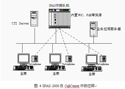 目前國內(nèi)呼叫中心的建設(shè)方興未艾,企業(yè)為了改善服務(wù),贏得客戶,紛紛建設(shè)自身的呼叫中心。如果建立呼叫中心全部采用國外設(shè)備,價格非常昂貴,使很多客戶望而卻步。這樣大的投資目前也只有電信(包括移動和聯(lián)通)、電力、銀行等資金充裕的行業(yè)才能承受。而且,根據(jù)我方了解,即使這些行業(yè)也在控制采購成本,原先只注重名牌,不計(jì)成本的情況正在改變。而在目前宏觀經(jīng)濟(jì)形勢不景氣的大背景下,大中型企業(yè)既要加快企業(yè)信息化建設(shè),保住客戶,降低成本,又要精打細(xì)算,規(guī)避投資風(fēng)險(xiǎn)。我們掌握建立呼叫中心設(shè)備的所有核心技術(shù),因此在呼叫中心應(yīng)用方面有很大的價格優(yōu)勢,這樣就降低了擁有呼叫中心的門檻,在這個市場上也有很強(qiáng)的競爭力。采用SPAS-2000可編程交換機(jī)支持智能業(yè)務(wù)通用編程接口,可以作為CallCenter核心設(shè)備,應(yīng)用圖見圖4: