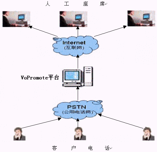 傳統(tǒng)方式為呼叫方撥通電話后直接進(jìn)入電信網(wǎng)絡(luò)以模擬信號(hào)的傳播與被叫方通話。VoPromote語(yǔ)音平臺(tái)的VOIP解決方案為:外呼電話接入VoPromote語(yǔ)音平臺(tái),通過(guò)VoPromote語(yǔ)音平臺(tái)的解析后模擬信號(hào)轉(zhuǎn)換為數(shù)字信號(hào)以Internet網(wǎng)為媒介進(jìn)行語(yǔ)音數(shù)據(jù)的傳輸。接收方只需在接入Internet網(wǎng)的計(jì)算機(jī)上安裝聲卡即可通過(guò)主機(jī)的聲音輸入/出接口來(lái)實(shí)現(xiàn)與對(duì)方的通話。從而利用網(wǎng)互聯(lián)網(wǎng)打一通"免費(fèi)電話"。