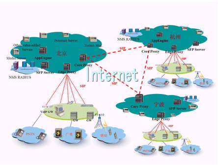 采用SIP作為統(tǒng)一的信令協(xié)議,NGN網(wǎng)絡(luò)體系結(jié)構(gòu),傳輸與控制分離,控制與業(yè)務(wù)分離。北京旋極及其合作伙伴提供整個端到端的基于SIP的電信全套解決方案。系統(tǒng)平臺由各種Proxy Servers(Firewall control Proxy,Edge Proxy,Core Proxy)組成路由網(wǎng)絡(luò);Location Server,Application Server,Presence Server,Media Server Cluster組成服務(wù)平臺的基本部分;互聯(lián)互通模塊:Core Proxy,Cisco AS5300網(wǎng)關(guān)或Softswitch。以下的簡化的示意圖: