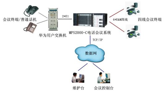 在接入上,通過2個數(shù)字中繼與華為大型用戶交換機(jī)互連,實(shí)現(xiàn)華為用戶交換機(jī)下的模擬用戶作為與會用戶的接入,也可通過華為交換機(jī)出局,實(shí)現(xiàn)PSTN網(wǎng)內(nèi)的用戶接入。