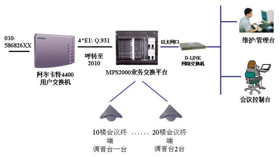 該會議系統(tǒng)通過4個數(shù)字中繼,與國電原有的阿爾卡特4400用戶交換機(jī)互連,通信采用Q.931信令。4路4線實現(xiàn)會議終端的接入,現(xiàn)使用3路,1路接國電10樓的調(diào)音臺,2路接20樓的調(diào)音臺,實現(xiàn)會議室擴(kuò)音設(shè)備的接入。通過以太網(wǎng)口與D-LINK網(wǎng)絡(luò)交換機(jī)互連,接入國電集團(tuán)的局域網(wǎng),實現(xiàn)維護(hù)管理及會議控制等功能。國電集團(tuán)的會議接入號為:010-586826XX,因原有交換機(jī)的功能局限,以該接入號到交換機(jī)后自動呼轉(zhuǎn)到2010進(jìn)入MPS2000會議系統(tǒng),實現(xiàn)會議的呼入。