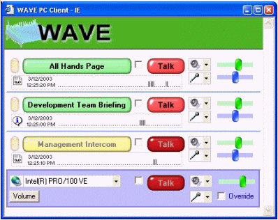 WAVE的使用方式為:管理員在服務(wù)器端建立IP電話會議,參加者使用本地計算機作為客戶端,通過耳機和麥克風(fēng)即可加入會議。一臺普通的奔四PC機可以支持數(shù)千個會議,每個會議也允許數(shù)百個用戶參加。管理員可以分配用戶不同的權(quán)利:如講話,主持會議等等。