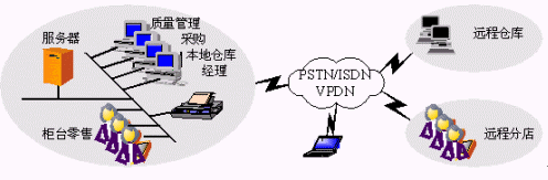 支持遠程庫房、遠程分店以及移動辦公。網(wǎng)絡(luò)拓撲結(jié)構(gòu)與連鎖經(jīng)營企業(yè)基本相同。