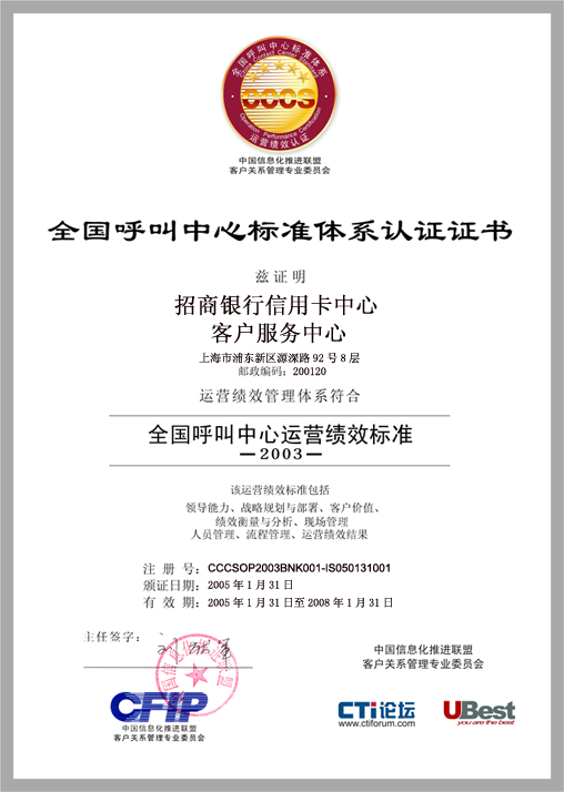 經(jīng)過長(zhǎng)達(dá)8個(gè)月時(shí)間的準(zhǔn)備和嚴(yán)格的認(rèn)證審核,由中國信息化推進(jìn)聯(lián)盟客戶關(guān)系管理專業(yè)委員會(huì)常務(wù)副主任郭晨東先生親自掛帥組成的項(xiàng)目評(píng)審專家小組從領(lǐng)導(dǎo)能力、戰(zhàn)略規(guī)劃與部署、客戶價(jià)值、績(jī)效衡量與分析、現(xiàn)場(chǎng)管理、人員管理、流程管理、運(yùn)營績(jī)效結(jié)果等八個(gè)范疇對(duì)招商銀行信用卡中心客戶服務(wù)部進(jìn)行了全面而嚴(yán)格的審核,涉及五大類上百項(xiàng)詳細(xì)的運(yùn)營績(jī)效指標(biāo),歷經(jīng)初審評(píng)估、現(xiàn)場(chǎng)初審、初審評(píng)估報(bào)告提交與確認(rèn)、標(biāo)準(zhǔn)試運(yùn)行、績(jī)效全面提升、最終評(píng)審等階段,最終審核確認(rèn)招商銀行信用卡中心客戶服務(wù)完全符合并部分超越《全國呼叫中心運(yùn)營績(jī)效標(biāo)準(zhǔn)》(CCCS-OP-2003)的各項(xiàng)標(biāo)準(zhǔn)指標(biāo)和要求,于2005年1月31日正式批準(zhǔn)招商銀行信用卡中心通過該標(biāo)準(zhǔn)的五星級(jí)認(rèn)證,授予“五星級(jí)客戶服務(wù)中心”稱號(hào)。