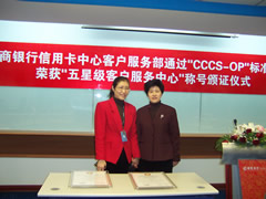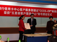 這天的上午10點(diǎn)30分,在招商銀行信用卡中心上?偛颗e行了簡(jiǎn)約而隆重的頒證儀式,信用卡中心常務(wù)副總經(jīng)理梁瑤蘭從信息產(chǎn)業(yè)部電子信息中心副主任、中國信息化推進(jìn)聯(lián)盟秘書長(zhǎng)劉獻(xiàn)軍手中接過證書,標(biāo)志著國內(nèi)第一家五星級(jí)客戶服務(wù)中心誕生了!