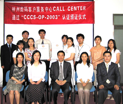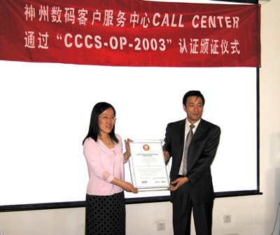 2005年6月2日,神州數(shù)碼呼叫中心通過了《全國呼叫中心運(yùn)營績效標(biāo)準(zhǔn)》(CCCS-OP-2003)認(rèn)證,并獲得由中國信息化推進(jìn)聯(lián)盟客戶關(guān)系管理專業(yè)委員會頒發(fā)的認(rèn)證證書(四星級客戶服務(wù)中心),成為國內(nèi)IT行業(yè)首家通過此認(rèn)證的呼叫中心。