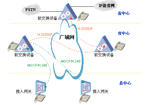 針對(duì)這種體系結(jié)構(gòu),軟交換技術(shù)就大有可為了,各地市布置軟交換設(shè)備,其間采用H.323/SIP點(diǎn)對(duì)點(diǎn)局間協(xié)議,負(fù)責(zé)各軟交換機(jī)之間的通信,在地市到縣區(qū)之間采用MGCP/H.248協(xié)議,這種協(xié)議體系充分吸取了軟交換體系控制與業(yè)務(wù)分離的思想,具有高度靈活性,可以兼容PSTN、運(yùn)營商IP語音網(wǎng)、原有PBX系統(tǒng)等,并且從多方面保障話音質(zhì)量;管理上由地市軟交換設(shè)備對(duì)縣區(qū)的接入網(wǎng)關(guān)設(shè)備進(jìn)行統(tǒng)一管理,號(hào)碼進(jìn)行統(tǒng)一分配;同時(shí),由地市軟交換設(shè)備提供多達(dá)數(shù)十種增值業(yè)務(wù),可以實(shí)現(xiàn)業(yè)務(wù)的統(tǒng)一升級(jí),簡單方便。