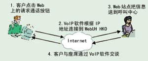 目前來講,把語音和Web在網(wǎng)絡上結合起來的理想途徑是VoIP。Web上的VoIP呼叫工作原理如圖1所示?蛻籼顚懸恍┗镜目蛻糍Y料后,點擊呼叫按鈕呼叫座席員。如果用戶的資料已經(jīng)在數(shù)據(jù)庫中的話,座席員就可以直接從瀏覽器上看到與該客戶相關的信息;如果用戶是第一次進入呼叫中心,座席員的瀏覽器上就會提示向客戶詢問并記錄客戶信息。對客戶來說,只需要一臺接入Internet的多媒體電腦和免費的客戶端軟件就可實現(xiàn)Web瀏覽和交談功能。