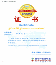 在CIPCA 2009中國IP通信大獎的評選活動中,科大訊飛憑借優(yōu)秀的企業(yè)形象和良好的市場口碑,以明顯優(yōu)勢在第一輪網(wǎng)上投票中脫穎而出;并在第二輪評選中得到了專家評委的一致認(rèn)可:由140名業(yè)內(nèi)資深高管組成的評委會對科大訊飛給予了極高的評價。最終,科大訊飛以絕對優(yōu)勢,無可爭議的再次問鼎“中國IP通信最佳語音識別技術(shù)提供商(國內(nèi))獎”這一重大獎項。