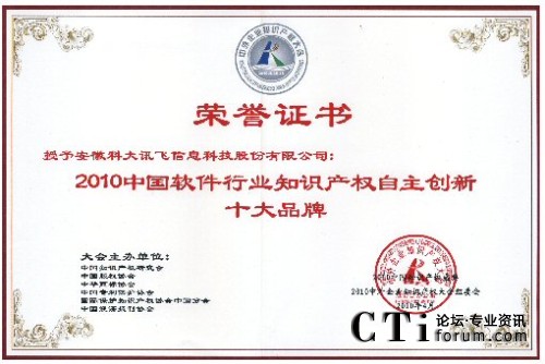 CTI論壇(ctiforum)4月29日消息(記者 潘婷婷):2010年4月25日,由中國知識產(chǎn)權研究會、中國專利保護協(xié)會、中國版權協(xié)會等單位聯(lián)合舉辦的“2010中外企業(yè)知識產(chǎn)權大會”在人民大會堂隆重舉行。在當日的“2010中國知識產(chǎn)權盛典頒獎典禮”中,科大訊飛憑借強大的自主創(chuàng)新能力以及在知識產(chǎn)權創(chuàng)造、保護與應用方面的突出表現(xiàn)獲評“2010年中國軟件行業(yè)知識產(chǎn)權自主創(chuàng)新十大品牌”。