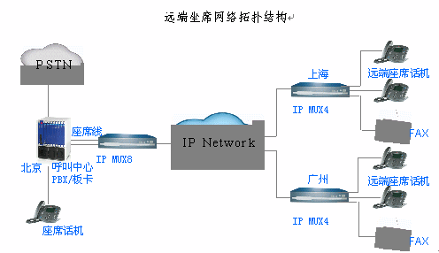 遠端坐席:根據實際遠端坐席數量,選擇IP MUX4/8/16網關,通過模擬用戶線接口連接坐席話機和傳真機;