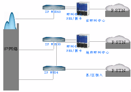 利用IP MUX系列網關可以把多個呼叫中心通過IP網絡匯接,中心的交換機負責所有呼叫的建立、釋放、應答和路由控制,并負責呼叫ID的產生和傳送。