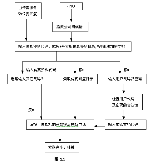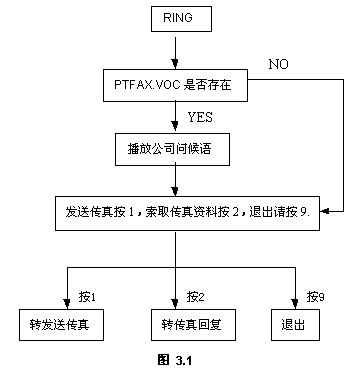 其中PTFAX.VOC存在當前工作路徑,如果存在,則播放公司問候語,接著播放下一句語音提示;如果該文件不存在,則系統(tǒng)直接播放VFGT.VOC的內(nèi)容,用戶可根據(jù)實際需求而定。