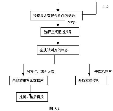 傳真發(fā)送功能是服務器后臺操作的,系統(tǒng)定時檢查傳真發(fā)送庫,一旦有符合條件的記錄,自動選擇空閑端口,按設(shè)定的傳真號碼撥號,檢查被叫方的狀態(tài),若對方有傳真機應答,則開始發(fā)送傳真;若對方忙、或無人接,系統(tǒng)稍后會再次試撥。若超過設(shè)定次數(shù)仍未發(fā)送成功,系統(tǒng)會通知發(fā)送人作其它處理。