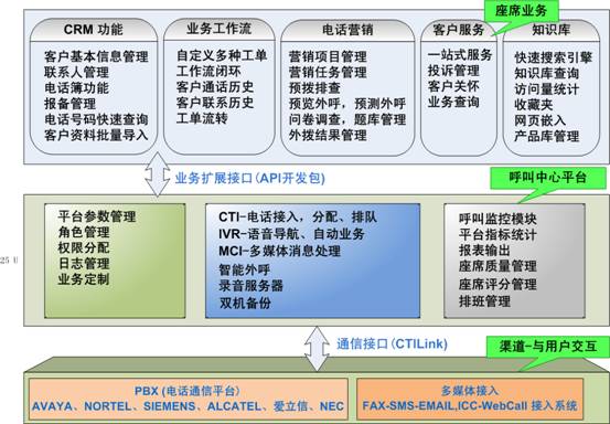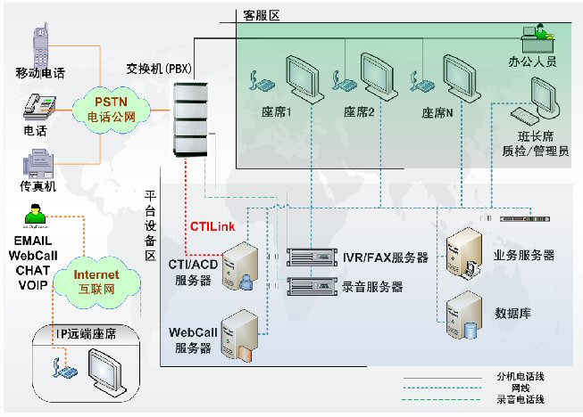 包含了PBX、CTI服務(wù)器、IVR/FAX服務(wù)器、錄音監(jiān)控 系統(tǒng)、報(bào)表統(tǒng)計(jì)系統(tǒng),CRM客戶(hù)管理等。