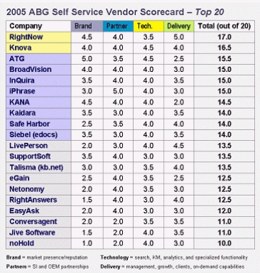 RightNow在所有20家廠商中以17分的高分名列第一(詳情請見http://www.selfservicescorecard.com/)。根據(jù)ABG的報告,得分超過16的廠商為當(dāng)前市場的領(lǐng)導(dǎo)者。得分超過14的廠商為10大重要廠商。