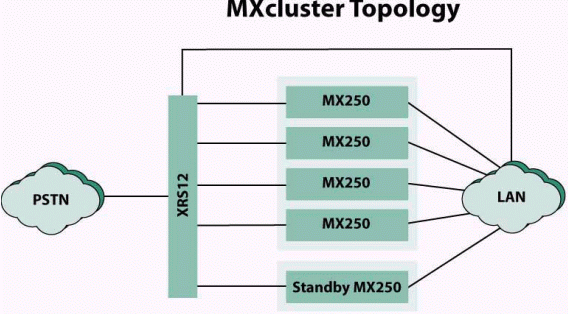 為支持冗余配置蘇迪思科技公司同時(shí)推出新產(chǎn)品XRS12物理連接轉(zhuǎn)換開(kāi)關(guān)。XRS12可被安裝在19英吋的機(jī)架上,并將占用機(jī)架中的1RU單元。MXcluster集群中每一臺(tái)MX250上的PSTN線路均通過(guò)XRS12連接至PSTN網(wǎng)絡(luò)。當(dāng)某一臺(tái)MX250出現(xiàn)故障時(shí),XRS12自動(dòng)將與該臺(tái)MX250對(duì)應(yīng)的PSTN網(wǎng)絡(luò)線路轉(zhuǎn)接至備份MX250上。使用XRS12,無(wú)需管理員介入操作,即可實(shí)現(xiàn)MXcluster集群與PSTN的不間斷連接。