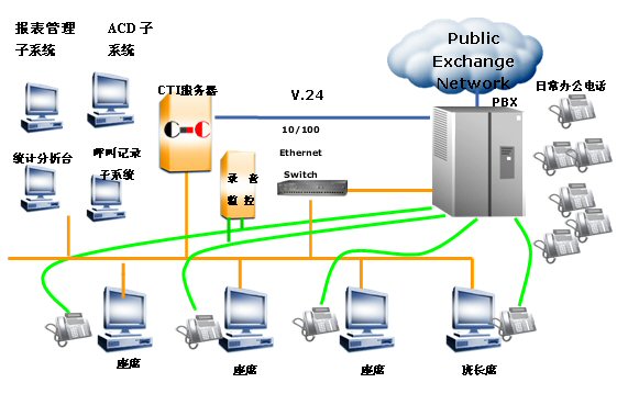 系統(tǒng)采用Siemens Hipath 3750交換機(jī),通過該型號(hào)交換機(jī)所具有的CTILink接口,向用戶提供了完整的呼叫控制功能,能夠滿足呼叫中心所應(yīng)有的電話控制的需求;同時(shí)提供ACD(自動(dòng)呼叫分配)功能,實(shí)現(xiàn)有效的分配話務(wù)。