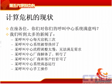 呼叫中心現(xiàn)在已經(jīng)了比較嚴重的計算危機,我聽到了很多,因為我重點是在搞技術(shù)這一行當(dāng),我就問一個問題,在座的各位,你們對你們的呼叫系統(tǒng)滿意嗎?我相信大部分人可能嘴上都說比較滿意,但是很多人對深層次的矛盾都非常清楚,為什么不滿意?