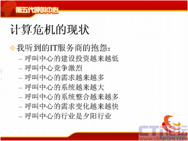 我們聽到IT服務(wù)商的抱怨可就更多了,說呼叫中心建設(shè)投資越來越低了,我在十年前建設(shè)一個20個座席的呼叫中心,能掙1500萬;可是現(xiàn)在20個座席的呼叫中心,10萬塊錢就把我打發(fā)了。呼叫中心競爭越來越激烈,投一個標,雖然一個呼叫中心只有100萬,這時候來的廠家有50家,相互壓價,相互壓價,這時候利潤都沒有了,F(xiàn)在的需求是越來越多了,體現(xiàn)在各個環(huán)節(jié),運營管理和業(yè)務(wù)模式上需求越來越多,最終客戶的要求也是越來越多,系統(tǒng)越來越大了,服務(wù)器也一大堆,以前一兩個服務(wù)器就夠了,現(xiàn)在需要4、5個,7、8個,這些服務(wù)器還需要相互進行聯(lián)絡(luò)整合,系統(tǒng)的整合越來越多,比如要和ERP整合,要和CRM整合,要和供應(yīng)鏈整合,系統(tǒng)的整合越來越多,而且需求變化越來越大,呼叫中心需求的變化產(chǎn)生于很多方面,后面我會仔細介紹。呼叫中心的行業(yè)變成一個夕陽行業(yè)了,這是現(xiàn)在做IT服務(wù)商普遍在提的想法。