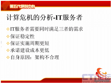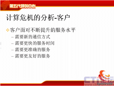 我分析一下計算的危機,計算危機來源于三個方面,第一是客戶面對不斷提升的服務(wù)水平,現(xiàn)在需要新的通信方式,包括電話、傳真、短信、電子郵件等等,還包括網(wǎng)上的護航瀏覽,表單共享,電子排版等等通信方式。第二方面需要更快的服務(wù)時間,80%的電話是20秒接起,可是短信的響應(yīng)時間為什么這么長,需要更準確的服務(wù),電話的服務(wù)是什么樣的,我現(xiàn)在需要網(wǎng)上交談的服務(wù)質(zhì)量也能夠得到保障等等,這是客戶對IT服務(wù)者提供的壓力。